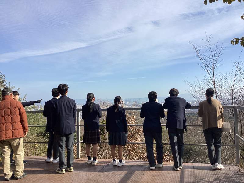そのあと、中学棟北側のモミジ谷にある北池からミニハイキングコースを登り、展望台まで駆けのぼりました。遥か向こうに生駒山を望み北摂の街並みに見入ってから、西に向かい、旧修養道場跡で制作中の炭焼き窯をみて山を下り、大淀校舎から持ち込まれた山道の入り口にある門柱にでました。