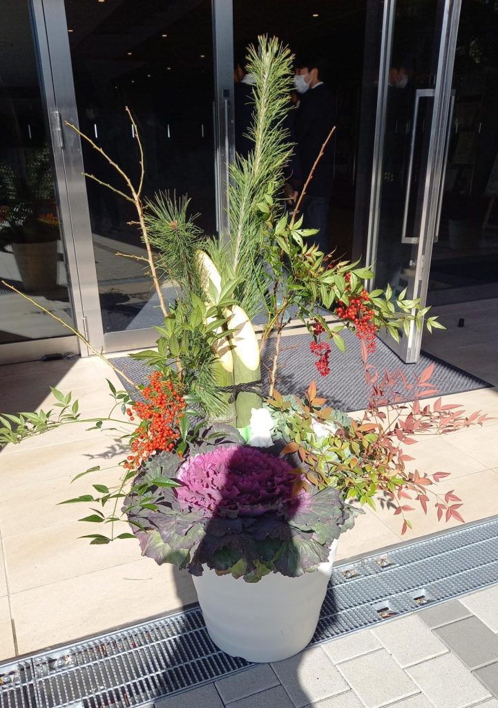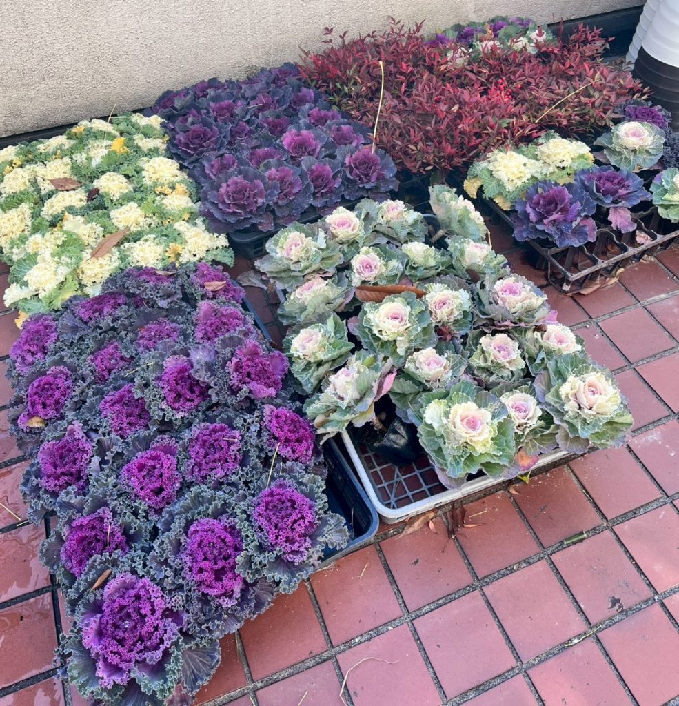 芸術棟前にはすでに門松用の竹・松・南天・梅、葉牡丹などがずらりと並んでおり、竹と松はかんくら山で採取したものだそうで、とても立派なものがたくさんありました。